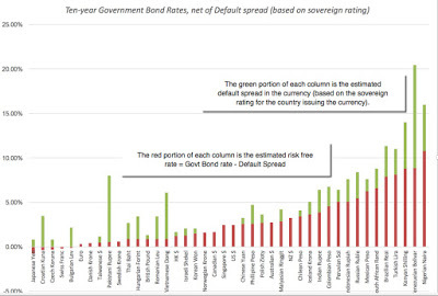 In this approach, you do not start with the presumption that governments are default free. Instead, you start with the local currency government bond rate and subtract out the portion of that rate that you believe is due to perceived default risk:Risk free rate in local currency = Local Currency Government Bond rate – Default Spread in Local Currency Government Bond rateThe practical question then becomes how best to estimate the local currency default spread and there are a few approaches, though each comes with limitations. The first is to find a US dollar denominated bond issued by the government in question and netting out the US T.Bond rate, thus getting a default spread on the bond. The second is to use a sovereign CDS spread for the country as a proxy for default risk. In the table below, Subtracting these default spreads from the local currency bond rates, on the assumption that default risk in both local and foreign currency borrowing is equivalent, would yield local currency risk free rates. Using the sovereign rating-based default spreads, we can estimate the risk free rates in different currencies in January 2017: