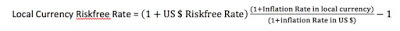 The third approach is to ignore government bond rates in the local currency entirely, either because you believe that they are not liquid enough to yield reliable numbers or because they contain default risk. Instead, you start with a risk free rate in a currency where you believe that the government bond rate is a reliable measure of the risk free rate (US Treasury Bond, German Euro Bond) and then add to this number the differential inflation rate between the US dollar and the local currency.Local Currency Risk free Rate = US $ Risk free Rate + (Expected inflation in local currency – Expected inflation in US $)This is an approximation that works reasonably well when local currency inflation is low (close to the US dollar inflation rate) but the more precise version of this formulation will be based upon compounding, just as the Fisher equation was: