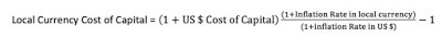 Currency Cost of Capital If you start with a risk free rate in a local currency and build up to a cost of capital using equity risk premiums and default spreads, often available only in dollar-based markets, you are effectively assuming that risk premiums are absolute numbers that don't change as the risk free rate changes. Thus, the equity risk premium of 5.69%, estimated in a dollar-based US market, applies not only to the US dollar risk free rate of 2.45% but also to the Nigerian Naira risk free rate of 10.77%. That is a stretch, since you would expect to risk premium you charge to be higher with the latter than the former. There is an easy and logical fix for it and it lies in the differential inflation approach. Rather than apply it to adjust the US$ riskfree rate to a local currency rate, you could apply it to the cost of equity or capital instead: