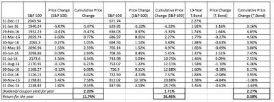The best place to see how the year unfolded for stocks is to trace out how the S&P 500 (large cap stocks), the S&P 600 (for small cap stocks) and US ten-year treasury bond rate did on a month by month basis through 2016.
