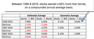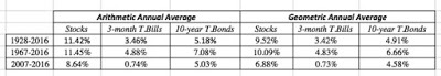 To put these returns in perspective, I added the S&P 500 and treasury bond return for 2016 to my historical data series which goes back to 1928 and computed both simple and compounded (geometric) annual averages in both for the entire period and compared them to a annualized 3-month treasury bill return (which you can think of as the return for holding cash).
