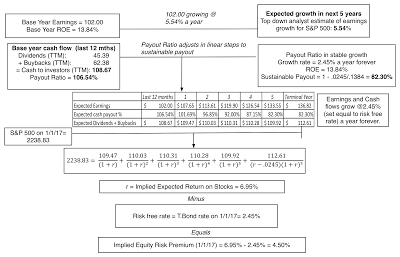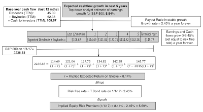 Looking at the past may give us comfort but investing is always about the future. I have been a long-time skeptic of historical risk premiums for two reasons. First, as noted in the table above, they are noisy (have high standard errors). Second, they assume mean reversion, i.e., that US equity markets will revert back to what they have historically delivered as returns and that is an increasingly tenuous assumption. It is for this reason that I compute a forward-looking estimate of the equity risk premium for the US, using the S&P 500 Index as my measure of US stocks. Specifically, I estimate expected cash flows from dividends and buybacks from holding the S&P 500 for the next five years, using the trailing 12-month cash flow as my starting point and an expected growth rate in earnings as my proxy for cash flow growth and use these estimates, in conjunction with the index level on January 1, 2017, to compute an internal rate of return (a discount rate that will make the present value of the expected cash flows on the index equal to the traded level of the index).