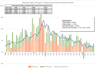 Download spreadsheet with historical ratesEntering 2017, the ten-year treasury bond at 2.45% is well below the intrinsic risk free of 3.60%, obtained by adding the inflation rate to real GDP growth through much of 2016. It is entirely possible that the economy will revert back to its post-2008 sluggishness or that there will be other shocks to the global economic system that will cause inflation and real growth to recede and interest rates to stay low, but for the moment at least, it looks like interest rates are their journey back to a new normal. If I were advising the Fed, my suggestion is for them is to act quickly on rates (perhaps as early as the next meeting) in order to preserve the fiction that it is they who are setting rates, rather than following them.