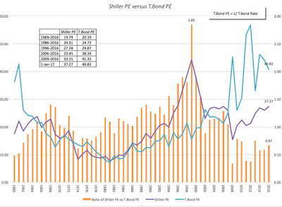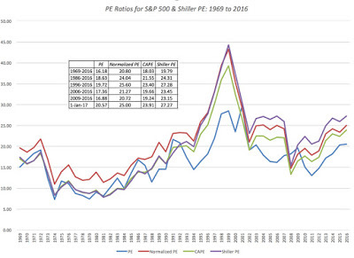 PE, CAPE and Bond PE Ratios I am not a fan of PE crystal ball gazing but I know that there are many who make their market judgments based on PE ratios. Updating a graph that I last used when I posted on CAPE last year to reflect the numbers at the start of the 2017, here is what the updated PE ratios look like for the S&P 500: