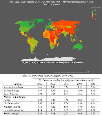 If your focus stays on economic risk, the question of whether democracies or authoritarian regimes are less risky for businesses to operate in depends in large part on whether these businesses are more unsettled by day-to-day continuous risk, which is often the case with democracies, where the rules can change when new governments gets elected, or by discontinuous risk, which can lie dormant for long periods, but when it does occur, it is larger and sometimes catastrophic, in an authoritarian government. Assessing freedom and democracy in countries is a fraught exercise, with both political and regional biases playing out, and that should be kept in mind when you look at the heat map that shows the results of the Economist's measures of democracy, by country and region, in 2022, as well as trend lines across time: