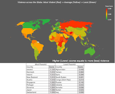 Iceland and Denmark top the list of most peaceful countries, but in a sign that geography is not destiny, Singapore makes an appearance on that list as well. On the lease peaceful list, it should come as no surprise that Russia and Ukraine are on the list, but Sub-Saharan Africa is disproportionately represented.