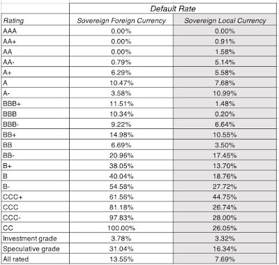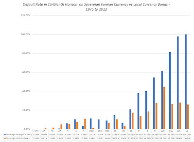 Note that while countries are less likely to default on local currency than foreign currency bonds, the default rates in the former remain substantial. In addition, the good news, if you are a user of sovereign ratings, is that they clearly are correlated strongly with ratings, with higher default rates for lower-rated sovereigns. I know that there are many who have issues with the ratings agencies, but I do think that the conflict of interest story, where ratings agencies attach higher ratings to entities, because they get paid to rate them, is overdone, and especially so with sovereign ratings (where the revenue streams are paltry). In my view, the biggest problem with ratings agencies is not that they are biased, but that they take too long to adjust ratings to changes in a country and that they sometimes underrate or overrate regions of the world, because of their histories. Consequently, Latin American countries have to work harder to improve their ratings, or sustain current ratings, than the US or European countries, which get a bye, because they do not have a history of default.