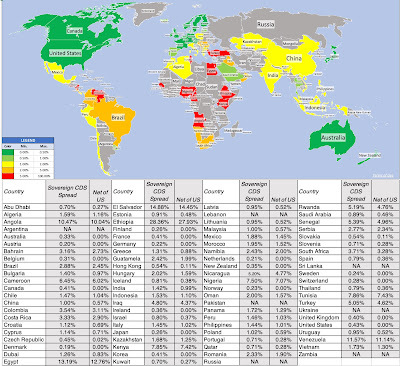 There are three things to note, as you browse these numbers. The first is that these are dollar spreads (though a Euro CDS market exists as well), and thus are most suited for use with dollar-denominated government bonds. The second is that what comprises default in the sovereign CDS market may not coincide with investor definitions of default , though there are approaches that can be used to back out the likelihood of default from a CDS value. The third is that there are no countries with traded CDS that have zero risk of default, at least according to the sovereign CDS market. Consequently, I have also computed a version of the sovereign CDS spread that is net of the US CDS (on the assumption that default risk is zero in the US, a debatable proposition after the recent debt ceiling debate). Is a sovereign CDS spread a better measure of default risk than a sovereign rating? The answer is mixed. It is true that a sovereign CDS spread gives you a more updated measure of default risk, since it is market-set, but as with all market-based measures, it comes with far more volatility and overshooting than a ratings-based spread, and it is available for only a subset of countries. My suggestion is that for countries where recent political or economic events would lead you to believe that sovereign rating is dated, you should switch to using sovereign CDS spreads.