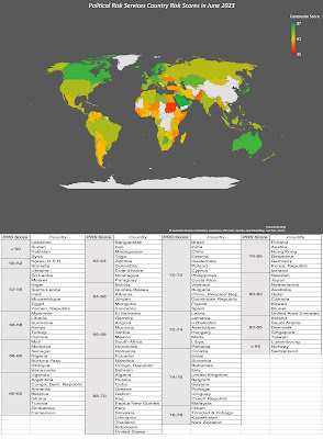 There are many services, including the World Bank and the Economist, who offer comprehensive country risk scores, and the map below includes composite country risk scores from Political Risk Services in June 2023: