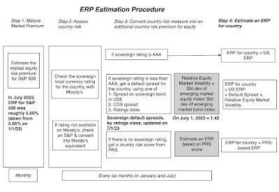To estimate the equity risk premium, for most countries I start with default spreads, either based on the sovereign ratings assigned by the ratings agencies, or from the market, in the form of sovereign CDS spreads. To account for the fact that equities are riskier than bonds, I scale the standard deviation of an emerging market equity index (S&P Emerging BMI) to an emerging market government bond ETF ), and use this ratio (1.42 in my July 2023 update) and apply this scalar to the default spread, to arrive at a country risk premium. Adding that country risk premium on to the premium that I estimate for the S&P 500 (which was 5.00% at the start of July 2023, and is my measure of a mature market premium), yields the total equity risk premium for a country:
