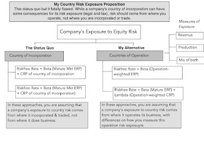 For much of my valuation journey, the status quo in valuation has been to look at where a company is incorporated to determine its risk exposure (and the equity risk premium to use in assessing a hurdle rate). While I understand that where you are incorporated and traded can have an effect on your risk exposure, I think it is dwarfed by the risk exposure from where you operate. A company that is incorporated in Germany that gets all of its revenues in Turkey, is far more exposed to the country risk of Turkey than that of Germany. In the picture below, I contrast the traditional country-of-incorporation based risk measure with my alternative, where equity risk premiums come from where you operate: