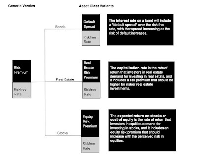 The risk premium that you demand has different names in different markets. In the corporate bond market, it is a default spread, an augmentation to the interest rate that you demand on a bond with more default risk. In the real estate market, it is embedded in a capitalization rate, an expected return used by real estate investors to convert the income on a real estate property into a value for that property. In the equity market, it is the equity risk premium, the price of risk for investing in equities as a class.