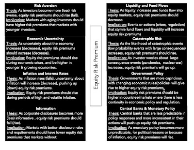 Since the equity risk premium is a price for risk, set by demand and supply, it stands to reason that it is driven not only by economic fundamentals, but also by market mood. Equities represent the residual claim on the businesses in an economy, and it should come as no surprise that the fundamentals that determine it span the spectrum: