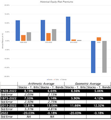 While we cannot explicitly observe what investors are demanding as equity risk premiums, we can observe what they have earned historically, investing in stocks instead of something risk free (or close). In the US, that data is available for long periods, with the most widely used datasets going back to the 1920s, and that data has been sliced and diced to the point of diminishing returns. At the start of every year, I update the data to bring in the most recent year's returns on stocks, treasury bonds and treasury bills, and the start of 2023 included one of the most jarring updates in my memory: