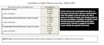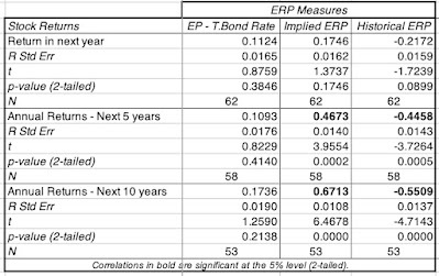 If the correlations across time in stock returns were zero, this approach would yield results similar to just using the averages (historical risk premiums), but it they are not, it will lead to different predictions. Looking at historical returns, the correlations start off close to zero for one-year returns but they do become slightly more negative as you lengthen your time periods; the correlation in returns over 5-year time periods is -0.15, but it is not statistically significant. However, with 10-year time horizon, even that mild correlation disappears. In short, while it may be possible to coax a predictive model using only historical stock returns, that model is unlikely to yield much in actionable predictions. There are sub-periods where the correlation is higher, but I remain skeptical of any ERP prediction model built around just the time series of stock returns.