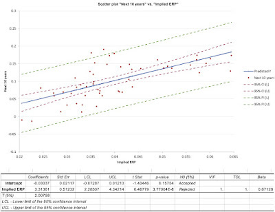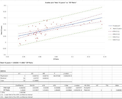 Expected Return on Stocks, conditional on EP = .00254 + 1.4543 (.04) = .0607 or 6.07%ERP based on EP-based Expected Return = 6.07% - 3.97% = 2.10%It is worth remembering that the expected return predictions come with error, and the more appropriate use of this regression is to get a range for the expected annual return, which yields predictions ranging from 4% to 8%. Extending the regression back to 1928 increases the R-squared and results in some regressions that yield predicted stock returns that are lower than the treasury-bond rate, i.e., a negative equity risk premium, given the EP ratio today.