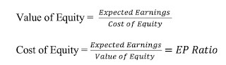In short, the earnings to price ratio becomes a rough proxy for what you can expect to earn as a return on stocks, if you are willing to assume no earnings growth or that firms generate no excess returns.