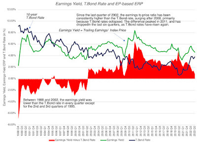 First, with the longer time-period predictions, where the predictive power is strongest, the same data is counted multiple times in the regression. Thus, with 5-year returns, you match the EP ratio at the end of 1960 with returns from 1961 to 1965, and then the EP ratio at the end of 1961 with returns from 1962 to 1966, and so on. While this does not imply that you cannot run these regression, it does indicate that the statistical significance (R squared and t statistics) are overstated for the longer time horizons. In addition, the longer your time horizon, the more data you lose. With a 10-year time horizon, for instance, the last year that you can use for predictions is 2012, with the EP ratio in that year matched up to the returns from 2013-2022. Second, as is the case with the first approach (historical risk premiums), you are assuming that the structural model is stable and that there will be mean reversion. In fact, within this time period (1928 - 2022), the predictive power is far greater between 1928 and 1960 than it is betweeen 196 and 2022.Third, while these models tout high R-squared, the number that matters is the standard error of the predictions. Predicting that your annual return will be 6.07% for the next decade with a standard error of 2% yields a range that leaves you, as an investor, in suspended animation, since you face daunting questions about follow through: Does a low expected return on stocks over the next decade mean that you should pull all of your money out of equities? If yes, where should you invest that cash? And when would you get back into equities again?Proponents of this approach are among the most bearish investors in the market today, but it is worth noting that this approach would have yielded “low return” predictions and kept you out of stocks for much of the last decade.3. The Fed Model: Earnings Yield and ERP