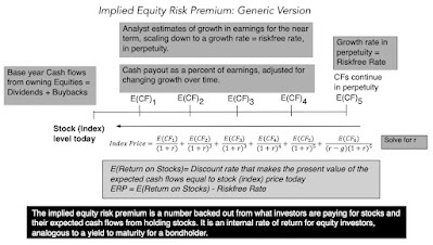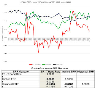 Conclusion I hope that this post has helped to convince you that the equity risk premium is central to investing, and that even if you have never used the term, your investing actions have been driven by its gyrations. I also hope that it has given you perspective on why you see the differences in equity risk premium numbers from different sources. With that said, here are some thoughts for the road that can help you in future encounters with the ERP:There is a true, albeit unobservable, ERP: The fact that the the true equity risk premium is unobservable does not mean that it does not exist. In other words, the notion that you can get away using any equity risk premium you want, as long as you have a justification and are consistent, is absurd. So, whatever qualms you may have about the estimation approaches that I have described in this post, please keep working on your own variant to get a better estimate of the ERP, since giving up is no an option.Not all estimation approaches are created equal: While there are many approaches to estimating the equity risk premium, and they yield very different numbers, some of these approaches have more heft, because they offer better predictive power. Picking an approach, such as the historical risk premium, because its stability over time gives you a sense of control, or because everyone else uses it, makes little sense to me.Your end game matters: As I noted at the start of this post, the equity risk premium can be used in a multitude of investment settings, and you have to decide, for yourself, how you will use the ERP, and then pick an approach that works for you. I am not a market timer and estimate an equity risk premium primarily because I need it as an input in valuation and corporate finance. That requires an approach that yields positive values (ruling out the EP-based ERP) and moves with with stock returns in subsequent periods (eliminating historical ERP). Market timers face a more acid test: If you are using equity risk premiums or even earnings yield for market timing, recognize that having a high R-squared or correlation in past returns will not easily translate into market-timing profits, for two reasons. First, the past is not always prologue, and market and economic structures can shift, undercutting a key basis for using historical data to make predictions. Second, even if the correlations and regressions hold, you may still find it hard to profit from them, since you (and your clients, if you are a portfolio manager) may be bankrupt, before your predictions play out. Statistical noise (the standard errors on your regression predictions) can create havoc in your portfolios, even if it eventually gets averaged out.