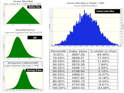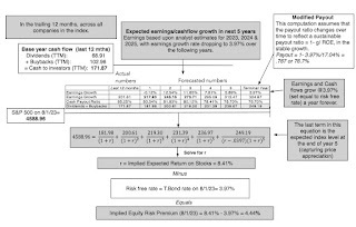 In August 2023, this model would have yielded an equity risk premium of 4.44% for the S&P 500, using trailing cash flows from the last twelve months as a starting point, estimating aggregate earnings for the companies from analyst estimates, for the next three years, and then scaling that growth down to the risk free rate, as a proxy for nominal growth in the economy, after year 5: