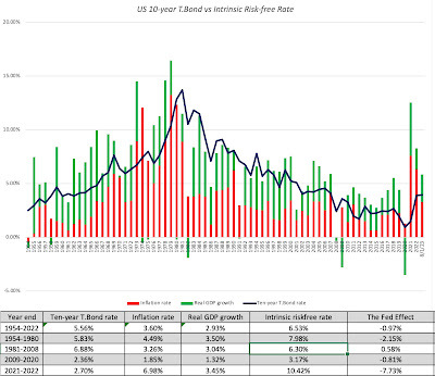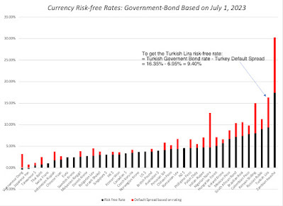 The mechanism that allows for the discount rate adjustment to reflect currency is the risk free rate, with currencies with higher expected inflation carrying higher risk free rates. In a downloadable dataset linked at the end of this post, I estimate riskfree rates in global currencies, based upon the US T.Bond rate as the riskfree rate in US dollars) and differential inflation. To provide an example, using the IMF's estimate of expected inflation for 2023-28 of 3% for the US and 13.50% for Egypt, and building on the US treasury bond rate of 3.80%. the riskfree rate in Egyptian pounds is 14.38%. Riskfree Rate in EGP = (1+ US T.Bond Rate) (1 + Exp Infl in Egypt) (1+ Exp Infl in US) -1