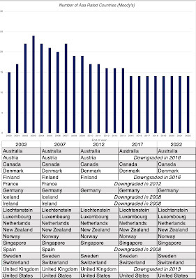 The most widely used measures of sovereign default risk come from a familiar source for default risk measures, the ratings agencies. S&P, Moody's and Fitch, in addition to rating companies for default risk, also rate governments, and they rate them both on local currency debt, as well as foreign currency debt. The reason for the differentiation is simple, since countries should be less likely to default, when they borrow in their domestic currencies, than when they borrow in a foreign currency. The table below summaries the sovereign local currency ratings for countries in June 2023, from S&P and Moody's: