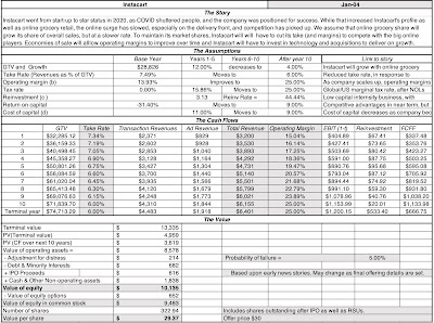 With these stories in place, I estimate revenues, earnings and cash flows for the businesses, and in sum, for the company, and use these cash flows to estimate a value per share for the company: