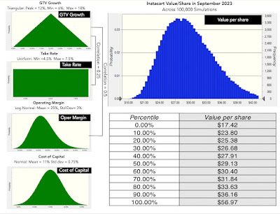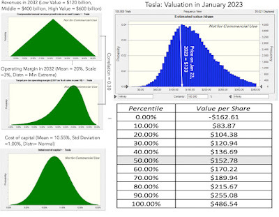 In 2022, the stock came back to earth with a vengeance, losing more than 65% of its equity value, leaving the stock (on a post-split basis) trading at close to $100 a share at the end of the year. Three weeks later, i.e., at the start of 2023, I revalued the stock, allowing for uncertainties in my estimate of revenues and margins to deliver a median value per share of $153, with significant variation in potential outcomes: