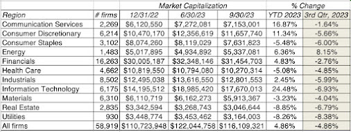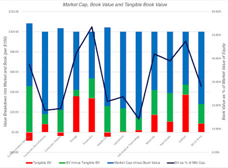 Over the last 25 years, as intangible assets have risen in value, goodwill has been, by far, the biggest single component of that value, accounting for about 60% of all intangibles on US corporate balance sheets; the jump in 2001 came from a change in accounting rules on acquisitions, when pooling was banned and companies were forced to recognize goodwill on all acquisitions. So what? I have long argued that goodwill is not an asset, intangible or not, but more a plug variable, signifying the difference between the price paid to acquire a target company and its book value, with adjustments for fairness, and designed to make balance sheets balance. Thus, much of the talk about intangibles in accounting has been just that, talk, with little of real consequence for balance sheets. There is another measure that you can use to see the futility, at least so far, of accounting attempts to value intangibles. In the graph below, I look at the aggregated market capitalization of companies, in 2022, which should incorporate the pricing of intangibles by the market, and compare that value to book value (tangible and intangible), by sector, reflecting accounting attempts to value these same intangibles.