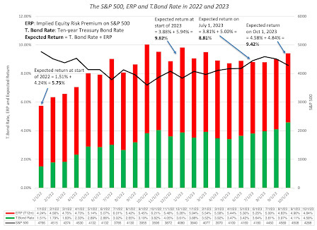 Market Timing: When you time markets, you are making a judgment on how an entire asset class (equities, bonds, real estate) is priced, and reallocating your money accordingly. In particular, if you believe that stocks are over priced, you will either have less of your portfolio invested in equities or, if you are aggressive, sell short on equities. Any statement about market pricing can be rephrased as a statement about equity risk premiums; if you believe that the equity risk premium, as priced in by the market, has become too low (relative to what you believe is justified, given history and fundamentals), you are arguing that stocks are over priced (and due for a correction). Conversely, if you believe that the equity risk premium has become too high, relative again to what you think is a reasonable value, you are contending that stocks are cheap, in the aggregate. Stock Picker: When you invest in an individual stock, you are doing so because you believe that stock is trading at a price that is lower than your estimate of its value. However, to make this judgment, you have to assess value in the first place, and while we can debate growth potential and profitability, the equity risk premium becomes an input into the process, determining what you should earn as an expected return on a stock. Put simply, if you are using an equity risk premium in your company valuation that is much lower (higher) than the market-set equity risk premium, you are biasing yourself to find the company to be under (over) valued. A market-neutral valuation of a company, i.e., a valuation of the company given where the market is today, requires you to at least to try to estimate a premium that is close to what the market is pricing into equities.Corporate Finance: The role of the equity risk premium in determining the expected return on a stock makes it a key input in corporate finance, as well, because that expected return becomes the company's cost of equity. That cost of equity is then embedded in a cost of capital, and as equity risk premiums rise, all companies will see their costs of capital rise. In a post from the start of this year, I noted how the surge in equity risk premiums in 2022, combined with rising treasury bond rates, caused the cost of capital to increase dramatically during the course of the year.Put simply, the equity risk premiums that we estimate for markets have consequences for investors and businesses, and in the next section, I will look at ways of estimating it.Measurement