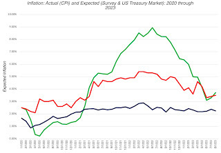 As you can see, this approach yields some "strange" numbers, with negative equity risk premiums for much of the 1990s, one of the best decades for investing in stocks over the last century. It is true that the equity risk premiums have been much more positive in this century, but that is largely because the treasury bond rate dropped to historic lows, after 2008. As interest rates have risen over the last year and a half, with stock prices surging over the same period, the equity risk premium based on this approach has dropped, standing at 0.41% at the start of August 2023. Since this is the approach used in the Wall Street Journal article, it explains the ERP being at a two-decade low, but I do find it odd that there is no mention that this approach yielded negative premiums in the 1980s and 1990s. In a variant, the Wall Street Journal article also looks at the difference between the earnings yield and the inflation-protected treasury rate, which yields a higher value for the ERP, of about 3%, but suffers from many of the same issues as the standard approach.