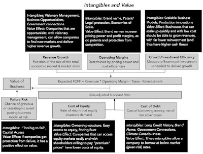 In the picture, I have highlight some of the key intangibles and which inputs are mostly likely to be affected by their presence. It is the operating margin where brand name, and the associated pricing power, is likely have its biggest effect, though it can have secondary effects on revenue growth and even the cost of capital. Good management, another highly touted intangible, will manifest in a business being able to deliver higher revenue growth, but also show up in margins and reinvestment; the essence of superior management is being able to find growth, when it is scarce, while maintaining profitability and not reinvesting too much. Connections to governments and regulators, an intangible that is seldom made explicit, can affect value by reducing failure risk and the cost of debt, while increasing growth and or profitability, as the company gets favorable treatment on bids for contracts.This is not a comprehensive list, but the framework applies to any intangible that you believe may have an effect on value. This approach to intangibles also allows you to separate valuable intangibles from wannabe intangibles, with the latter, no matter how widely sold, having little or no effect on value. Thus, a company that claims that it has a valuable brand name, while delivering operating margins well below the industry average, really does not, and the effect of ESG on value, no matter what its advocates claim, is non-existent. It is true that this approach to valuing intangibles works best for a company with a single intangible, whether it be brand name or customer loyalty, where the effect is isolated to one of the value drivers. It becomes more difficult to use for companies, like Apple, with multiple intangibles (brand name, styling, operating system, user platform). While you can still value Apple in the aggregate, breaking out how much of that value comes from each of the intangibles will be difficult, but as an investor, why does it matter?