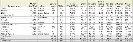 As you can see, these companies look very different from the sector aggregates, with solid revenue growth (median compounded growth rate of 8.66% a year, for the last decade) and exceptional operating margins (gross margins close to 70% and operating margins of 24%). Each of the companies also has a recognizable or many recognizable brand names, with LVMH and Hermes topping the list. In this business, at least, brand name seems to be dividing line between success and mediocrity, and having a well-recognized brand name contributes to growth and profitability. It is this grouping that I will draw on more, as I look valuing Birkenstock.