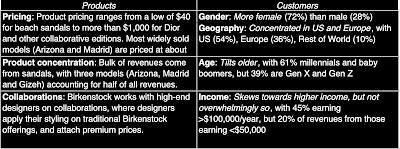 Along the way, serendipity played a role in the company's expansion. In 1966, a Californian named Margot Fraser, when visiting her native Germany, discovered that Birkenstocks helped her tired and hurting feet, and she convinced Karl Birkenstock to try selling the company's sandals in California. It is said that Karl advanced her credit, and helped her persuade reluctant California retailers to carry the company’s unconventional footwear in their stores. That proved timely, since people protesting against the war and society's ills latched on to these sandals, making them them symbolic footwear for the rebellious. in the 1990s, the brand had a rebirth, when a very young Kate Moss wore it for a cover story, and it became a hot brand, especially on college campuses. Today, Birkenstock gets more than 50% of its revenues in the United States, with multiple celebrities among its customers. The company's prospectus does a good job painting a picture of both the product offerings and customer base, leading into the IPO, and I have captured those statistics in the picture below:
