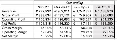 The surge in revenues has been particularly pronounced since 2020, the COVID year, with different theories on why the pandemic increased demand for the product; one is that people working from home chose the comfort of Birkenstocks over uncomfortable work shoes. The company's growth has come with solid profitability, and the table below shows key profit metrics over the last three years: