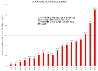 On the alternative energy front, as money has flowed into these companies, there has been a surge in enterprise value (equity and net debt) and market capitalization (equity value); I report both because impact investing can also take the form of green bonds, or debt, at these companies. The enterprise value of publicly traded alternative energy companies has risen from close to zero two decades ago to more than $700 billion in 2020, before losing steam in the last three years: