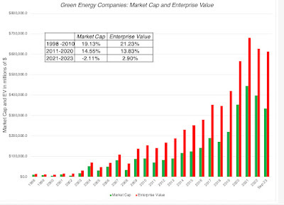 It is worth noting that even after their surge in market cap in the last decade, alternative energy companies have a cumulated enterprise value of about $600 billion in September 2023, a fraction of the $8.5 trillion of cumulated enterprise value at fossil fuel companies.