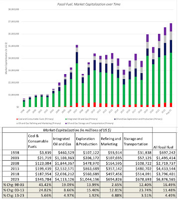 Adding in the value of private companies and start-ups in this space would undoubtedly push up the number further.On the fossil fuel front, the fossil fuel divestments have had an impact on market capitalizations, though there are signs that the effect is weakening: