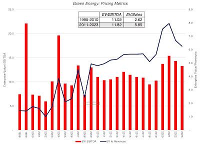 On the green energy front, to see if investors perceptions of these companies have changed, I look at two the pricing metrics for green energy companies - the enterprise value to EBITDA and enterprise value to revenue multiples: