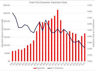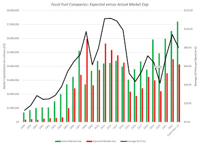 Oil Price Effect: The market capitalization of oil companies is dependent on oil prices, as you can see in the figure below, where the collective market capitalization of fossil fuel companies is graphed against the average oil price each year from 1970 to 2022; almost 70% of the variation in market capitalization over time explained by oil price movements.