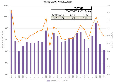 If divestitures are having a systematic effect on how markets are pricing fossil fuel companies, you should expect to see the actual market capitalizations trailing the expected market capitalization, based on the oil price. That seems to be the case, albeit marginally, between 2011 and 2014, but not since then. In short, the divestiture effect on fossil fuel companies has faded over time, with other investors stepping in and buying shares in their companies, drawn by their earnings power.Pricing: If impact investing is changing investor perceptions about the future growth and termination risk at fossil fuel companies, it should show up in how these companies are priced, lowering the multiples of revenues or earnings that investors are willing to pay. In the chart below, I look at the pricing of fossil fuel companies over time, using EV to sales and EV to EBITDA as pricing metrics: