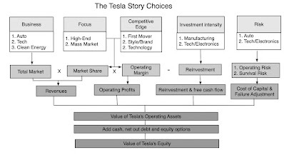 In subsequent valuations, I modified and adapted this story to reflect lessons that I learned about Tesla, along the way. First, I learned that the company was capable of generating growth much more efficiently, and more flexibly, than other auto companies, reducing the capital investment needed for growth. Second, I noticed that Tesla customers were almost fanatically attached to the company's products, and were willing to evangelize about it, yielding a brand loyalty that legacy auto companies could only dream about. Third, in a world where many companies are run by CEO who are, at best, operating automatons, and at worst, evidence of the Peter Principle at play, where incompetence rises to the top, Tesla had a CEO whose primary problem was too much vision, rather than too little. In valuation terms, that results in a company whose value shifts with narrative changes, creating not only wide swings in value, but vast divergences in opinion on value. In 2016, I looked at how Tesla's story would vary depending upon the narrative you had for the company and listed some of the possible choices in a picture: