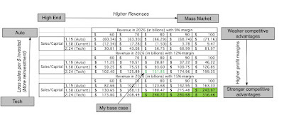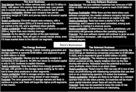 To bring these stories into play, I break Tesla down into four businesses - the auto business, the energy business, the software business and the robotaxi business. I do know that there will be Tesla optimists who will argue that there are other businesses that Tesla can enter, including insurance and robots, but for the moment, I think that the company has its hands full. I look out the landscape for these businesses in the picture below, looking at the potential size and profitability of the market for each of these businesses, as well as Tesla's standing in each.