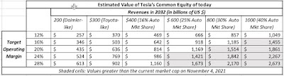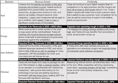 Note that the auto business is, by far, the largest in terms of revenue potential, but it lags the other business in profitability, especially the software and robotaxi businesses, where unit economics are favorable and margins much higher. Note also that estimates for the future in the robotaxi and auto software businesses are squishy, insofar as they are till nascent, and there is much that we do not know.My Tesla story for each of these businesses is below, with revenue and profitability assumption, broken down by business: