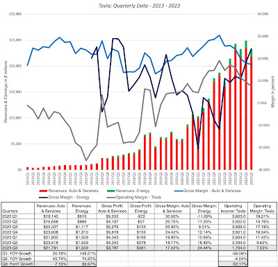 In the twelve months, ending September 2023, Tesla reported operating income of $10.7 billion on revenues of $95.9 billion; that puts their revenues well ahead of my 2013 projection of $65 billion, albeit with an operating margin of 11.18%, lagging my estimate of 12.5%. That makes Tesla the eleventh largest automobile company in the world, in revenue terms, and the seventh most profitable on the list, making it more and more difficult for naysayers to argue that it is a fad that will pass. Breaking down the news in the financials by business grouping, here is what the reports reveal: