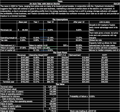 I was planning to start this post by telling you that Tesla was back in the news, but that would be misleading, since Tesla never leaves the news. Some of that attention comes from the company's products and innovations, but much of it comes from having Elon Musk as a CEO, a man who makes himself the center of every news cycle. That attention has worked in the company's favor over much of its lifetime, as it has gone from a start-up to one of the largest market cap companies in the world, disrupting multiple businesses in the process. At regular intervals, though, the company steps on its own story line, creating confusion and distractions, and during these periods, its stock price is quick to give up gains, and that has been the case for the last few weeks. As the price dropped below $200 today (October 30,2023), I decided that it was time for me to revisit and revalue the company, taking into account the news, financial and other, that has come out since my last valuation in January 2023, and to understand the dueling stories that are emerging about the company.
