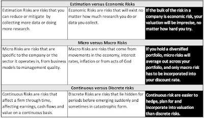 In any investment, there are multiple sources of risk, and listing all of them in a list, with no organization, can be not only overwhelming but directionless. Once you have identified the risks that you face, it is useful to break that risk down into categories, on three dimensions: