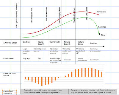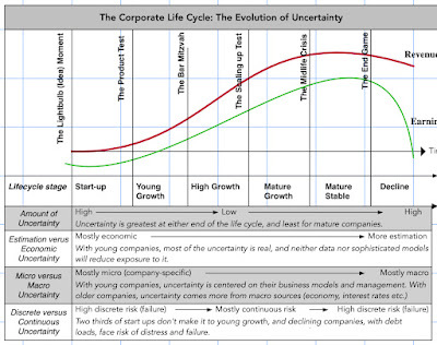 I argue that investors play the value game, buying investments when the price is less than the value and hoping for convergence, and that traders play the pricing game, buying and selling on market momentum, rather than fundamentals. At the risk of generalizing, safety capital, with its focus on earnings and cash flows now, is more likely to focus on fundamentals, and play the investor game, whereas risk capital, drawn by the need to make high returns quickly, is more likely to play the trading game. Thus, when risk capital is plentiful, you are more likely to see the pricing game overwhelm the value game, with prices often rising well above value, and more so for the riskiest segments of every asset class. A pull back in risk capital is often the catalyst for corrections, where price not only converges back on value, but often overshoots in the other direction (creating under valuations). It behooves both investors and traders to therefore track movements in risk capital, since it is will determine when long term bets on value will pay off for the former, and the timing of entry into and exit from markets for the latter.Corporate Life Cycle: The ebbs and flows of risk capital have consequences for all businesses, but the effects will vary widely across companies, depending on where they are in the life cycle. Using another one of my favorite structures, the corporate life cycle, you can see the consequences of expanding and shrinking risk capital, through the lens of free cash flows (and how they vary across the life cycle).