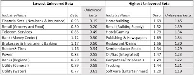 Before we embark on how to measure relative risk, where there can be substantial disagreement, let me start with a statement on which there should be agreement. Not all stocks are equally risky, and some stocks are more risky than others, and the objective of a relative risk measure is to capture that relative risk. The disagreements rise in how to measure this relative risk, and risk and return models in finance have tried, with varying degrees of success, to come up with this measure. At the risk of provoking the ire of those who dislike portfolio theory, the most widely model for risk, in practice, is the capital asset pricing model, and beta is the relative risk measure. Embedded in its usage is the assumption that the marginal investors in a stock, i.e., those large investors who set prices with their trading, are diversified, and that you can estimate the "non-diversifiable" risk in a stock, by regressing returns on a stock against a market index. I believe that a company's regression beta is an extremely noisy measure of its risk, and mistrust the betas reported on estimation services for that reason. I also believe that it is healthier to estimate the beta for a company by looking at the average of the regression betas of the companies in the sector that it operates in, and adjusting for the financial leverage choices of the company, since increasing dependence on debt also increases the relative risk of the company. As in prior years, I report industry-average betas, cleaned up for debt, at this link, for US companies, and you can sector-average beta for regional and global companies as well. At the start of 2022, the ten sectors (US) with the highest and lowest relative risk (unlettered betas), are shown below.