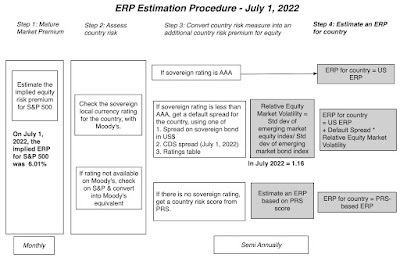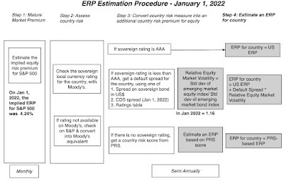 The equity risk premium for the US is the implied equity risk premium of 4.24%, the process of estimating which I described in an earlier data update post this year. The sovereign ratings for countries are obtained from Moody's and S&P, and the default spread for each ratings class comes from my estimates for the start of 2022. To illustrate, at the start of 2022, India was rated Baa3 by Moody's and the default spread (my estimate) for this rating was 1.87%. I scale that default spread up to reflect the higher volatility in stocks, relative to bonds, and I use 1.16, estimated from as the ratio of historical volatilities in S&P's emerging market stock to the volatility in an emerging bond indices. This approach yields a country risk premium of 2.18% for India, and an equity risk premium of 6.42%, to start 2022:
